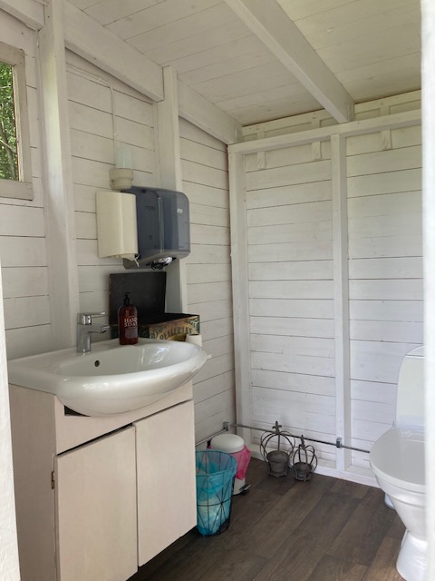Ett trevligt WC, tvättställ och utomhusdusch med vatten från GaviksTorpets lokala brunn finns att tillgå för våra tältgäster och övriga boende. För tillfälliga besökare utgår en mindre kostnad för att nyttja gästtoaletten.